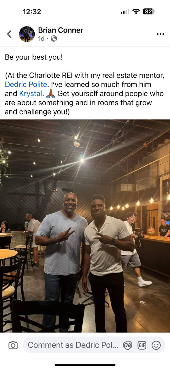 (At the Charlotte REI with my real estate mentor, Dedric Polite. I’ve learned so much from him and Krystal. 🙏🏾 Get yourself around people who are about something and in rooms that grow and challenge you!)"